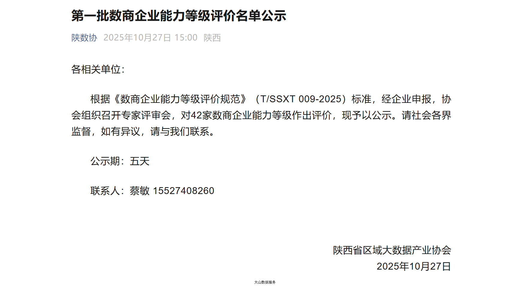近日,陕西省区域大数据产业协会(简称 “陕数协”)正式发布《第一批数商企业能力等级评价名单公示》,根据《数商企业能力等级评价规范》(T/SSXT 009-2025)标准,经企业自主申报、协会组织专家评审会严格评审,陕西大山软件科技有限责任公司(以下简称 “大山科技”)凭借在数字服务领域的扎实实力与稳健表现,成功入选名单并获评 “稳健级” 数商企业,标志着公司在数商能力建设上获得行业权威认可。