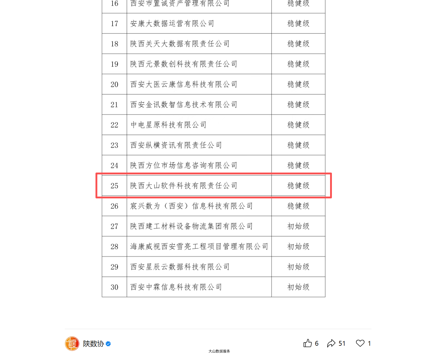 近日,陕西省区域大数据产业协会公示第一批数商企业能力等级评价名单。陕西大山软件科技有限责任公司凭借在数字服务领域的扎实实力与稳健表现,成功入选并获评“稳健级”数商企业,标志着其数商能力获得行业权威认可。