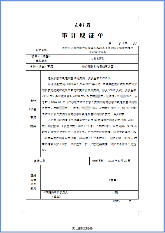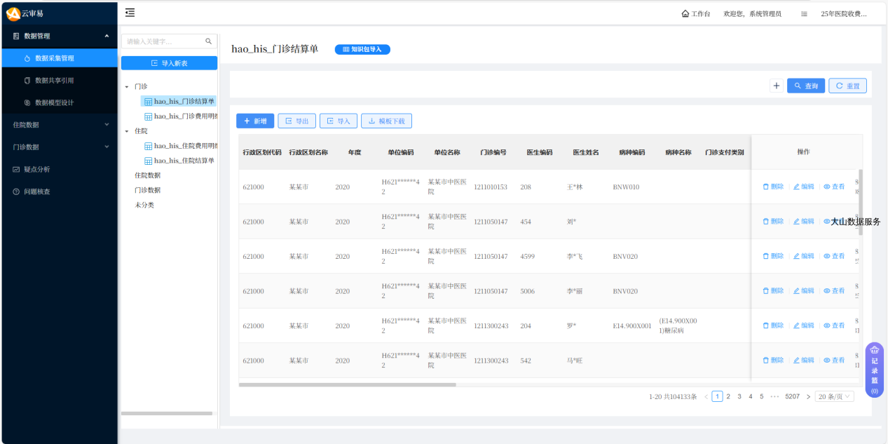 我国基本医保参保率维持在95%以上,医保基金年度支出超2.4万亿元。但定点医药机构等不规范使用基金问题多发频发,一些机构通过挂床住院、违规收费、串换项目、过度诊疗等手段违规使用医保基金,甚至虚构项目、诱导虚假就医购药等恶意骗取医保基金。在此背景下,开展医院收费系统大数据审计工作,运用创新审计手段,提高审计效率与精准度,保障医保基金安全、规范、高效运行,成为维护社会保障体系稳定、守护民众利益的关键之举。医院收费系统大数据审计在医院HIS系统收费核查及医保执行方面发挥着重要作用。医院收费系统大数据审计科学合理地开展,能纠正医院的经济管理活动中各种不良行为,避免医院资源的浪费,宏观管理医院卫生事业的管理,支持医院卫生事业的发展,确保医保基金的安全和合理使用,保障人民群众的切身利益,维护医疗保障制度的健康持续发展。近日,大山科技协助某市审计机关完成了医院收费系统大数据审计数据服务工作。