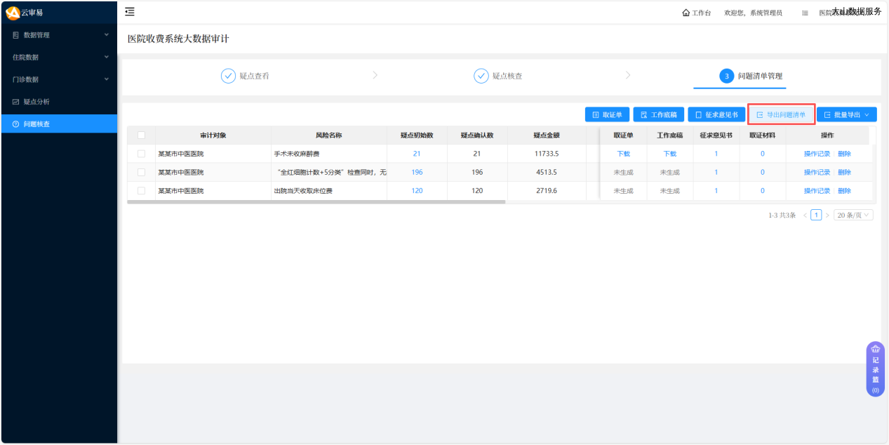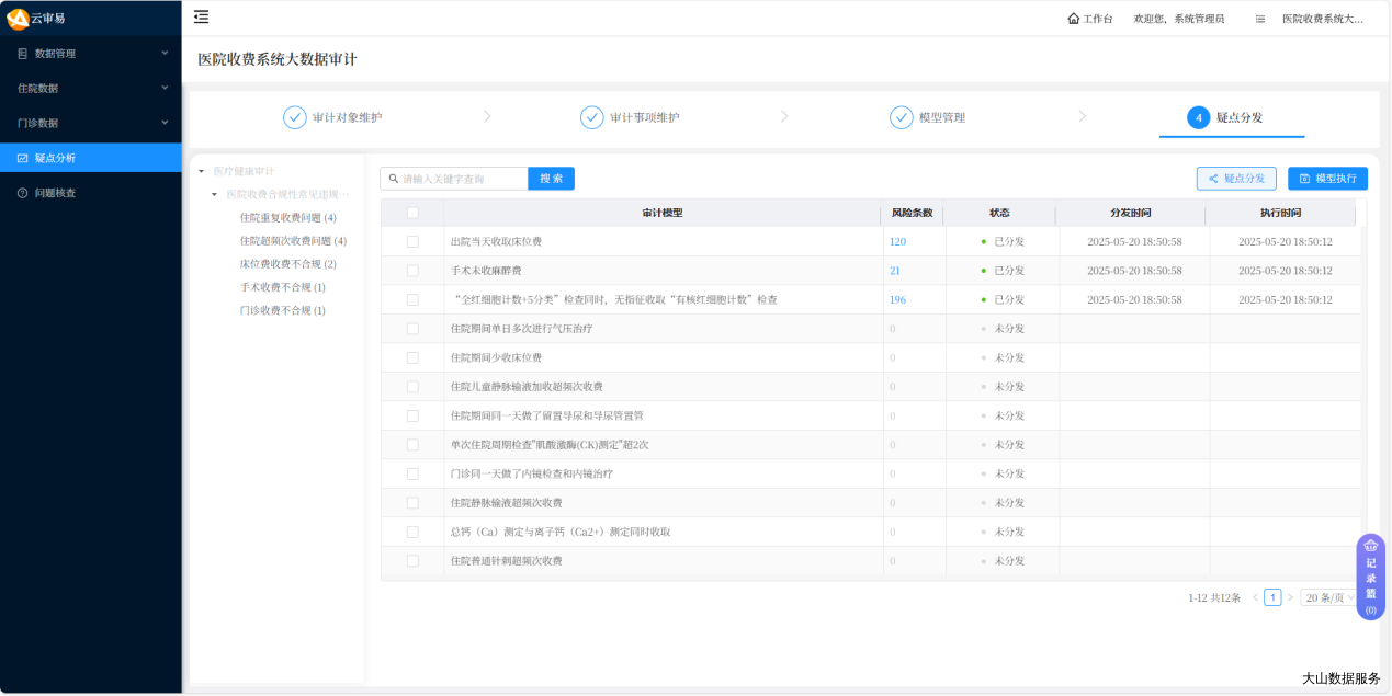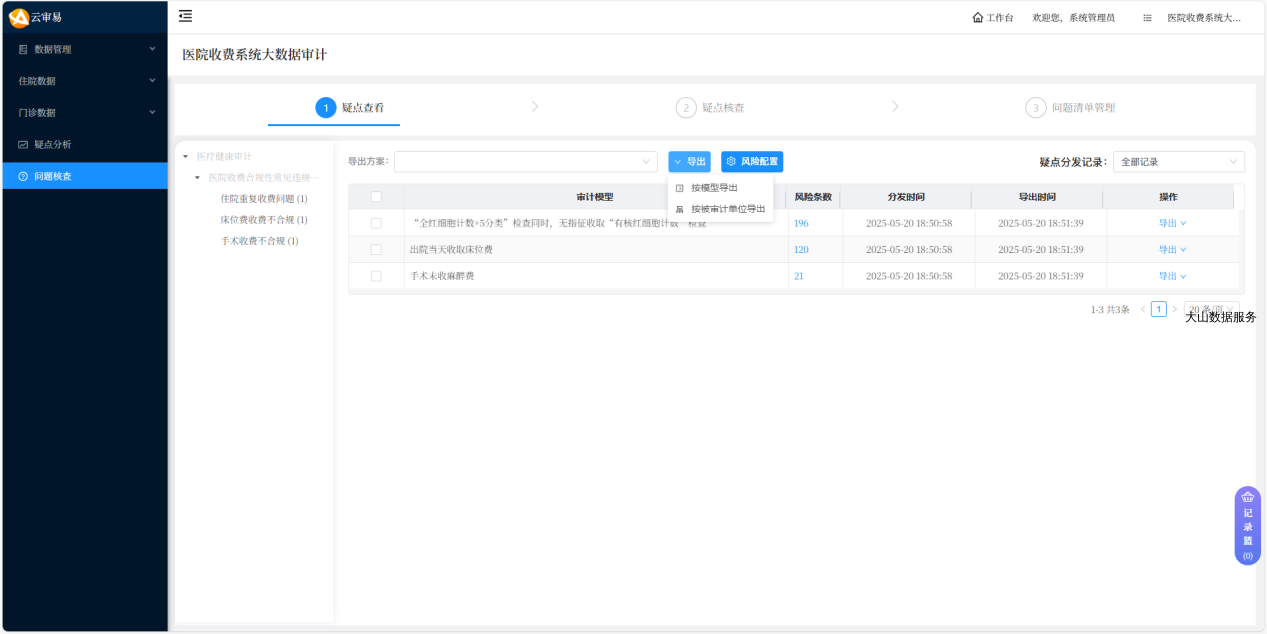 利用数据分析工具执行分析模型,按照审计事项生成问题疑点,输出疑点数据(按模型或被审单位导出)。