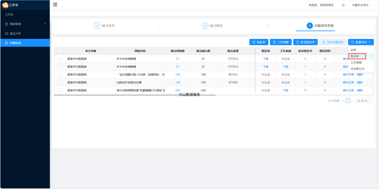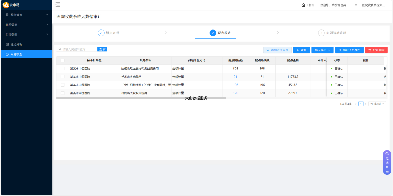 在本次医院收费系统大数据审计数据服务过程中,大山科技大数据审计团队借助自主研发的“云审易工作台系统”,高效、高质地完成了从数据采集、数据标准化、数据分析、疑点分发及问题核查、输出审计取证单、工作底稿、审计报告(征求意见书)的相关工作。在诊疗服务和收费结算方面分析核实问题三十二项,极大地减轻了现场审计团队在数据分析、文档编写中的工作量,有效保障了现场审计工作的顺利实施,为进一步提升审计质效夯实基础。